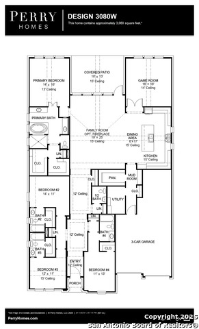 Step off the front porch into the extended entryway with a 12-foot rotunda ceiling. Off of the main hallway are two secondary bedrooms which offer full bathrooms and walk-in closets. Adjacent is a private guest suite featuring a full bathroom, walk-in closet and linen closet. As you enter into the vast family room you are greeted by a wood mantel fireplace and sliding glass door. French doors open into the game room which is located off of the dining area. The kitchen hosts an island with built-in seating, ample counterspace, 5-burner gas cooktop and a walk-in pantry. The primary bedroom offers three large windows. The primary bathroom hosts dual vanities, a freestanding tub, large glass enclosed shower, and two walk-in closets. Covered backyard patio and 6-zone sprinkler system. The mud room and utility closet are off of the three-car garage.